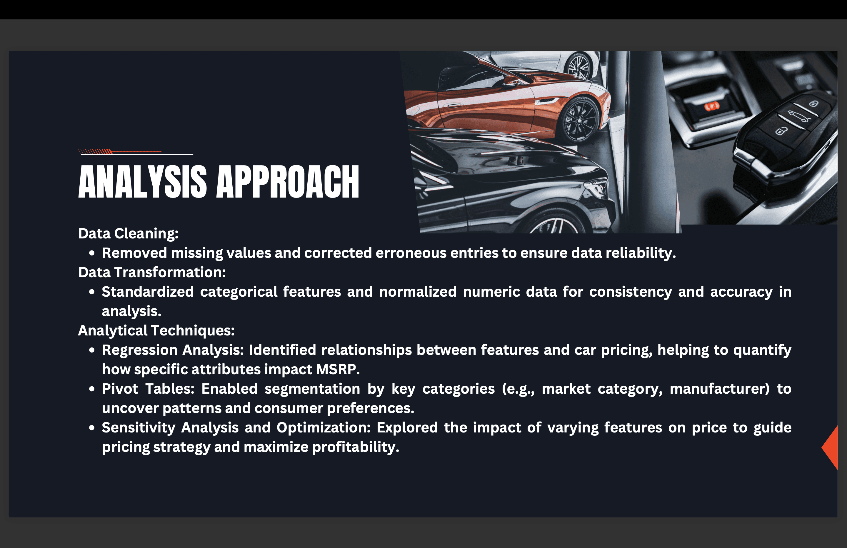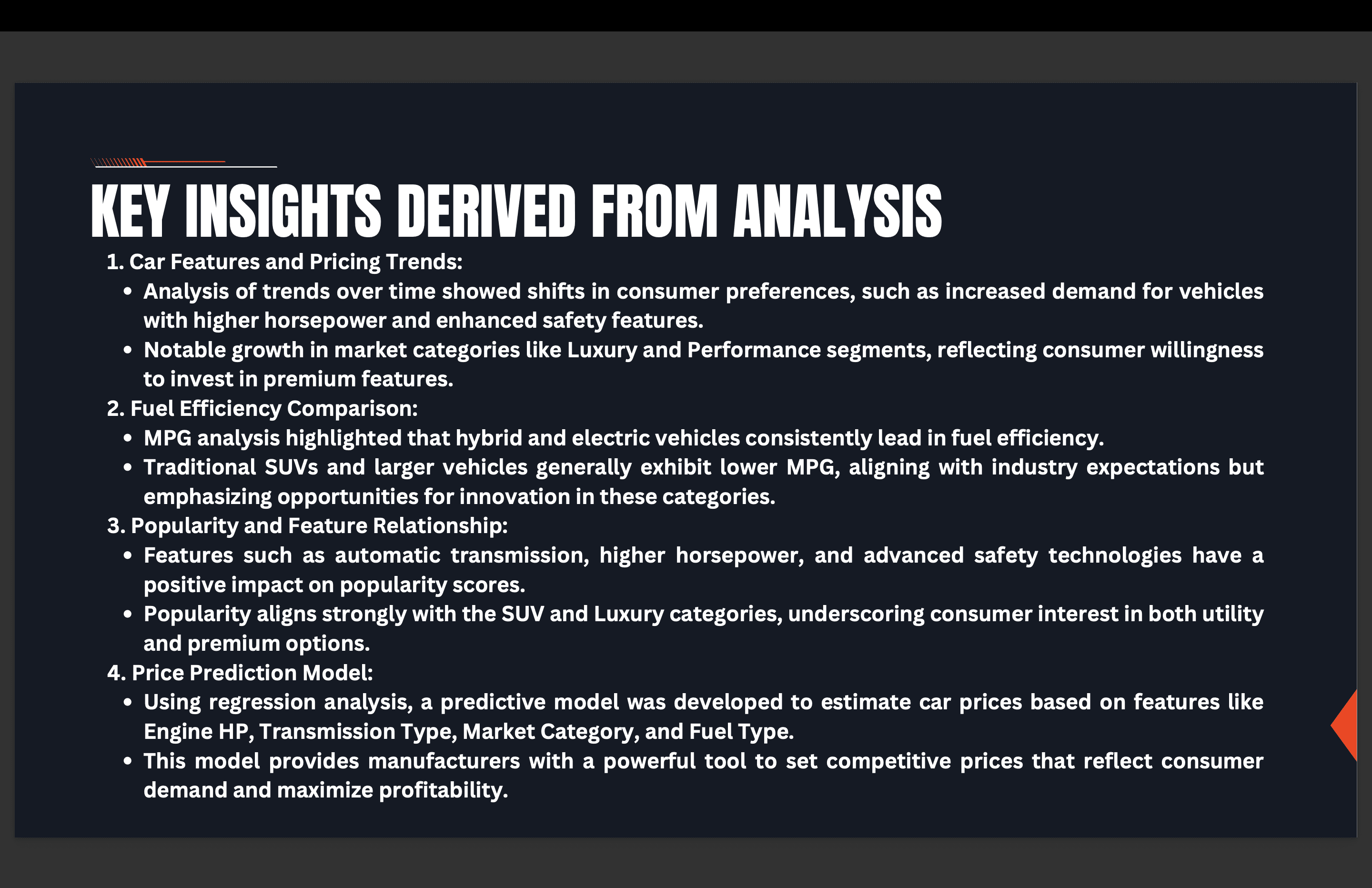 This project aimed to identify which car features most significantly affect pricing and profitability for manufacturers in a competitive and evolving market. The insights generated can guide pricing strategies and product development decisions to better align with consumer expectations and maximize returns.