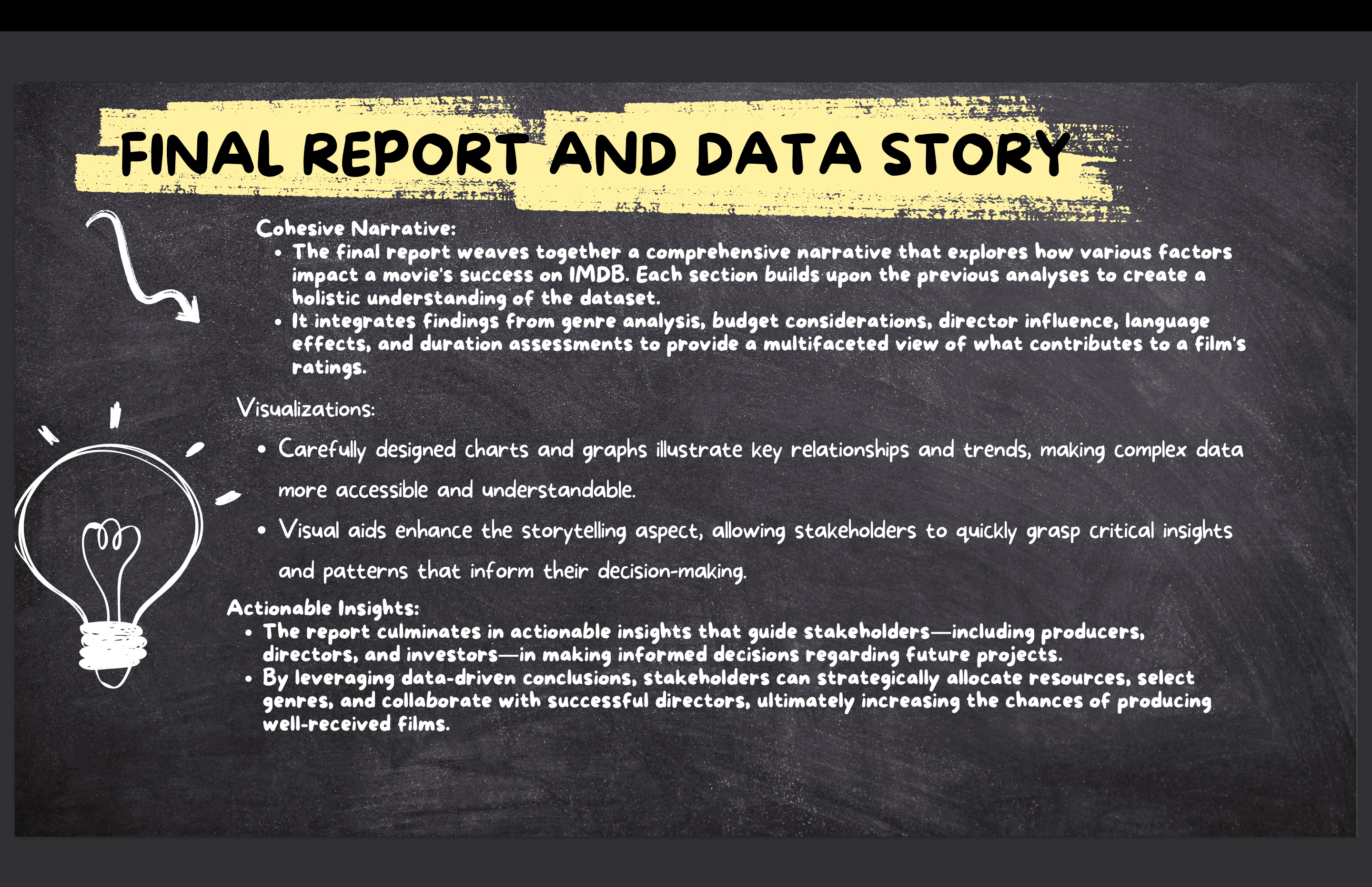 Cleaned and prepared the dataset, then conducted detailed analysis using Excel to explore how genre, duration, and other variables affect IMDB scores. Used storytelling and visualization techniques to present insights for industry stakeholders like producers and directors.