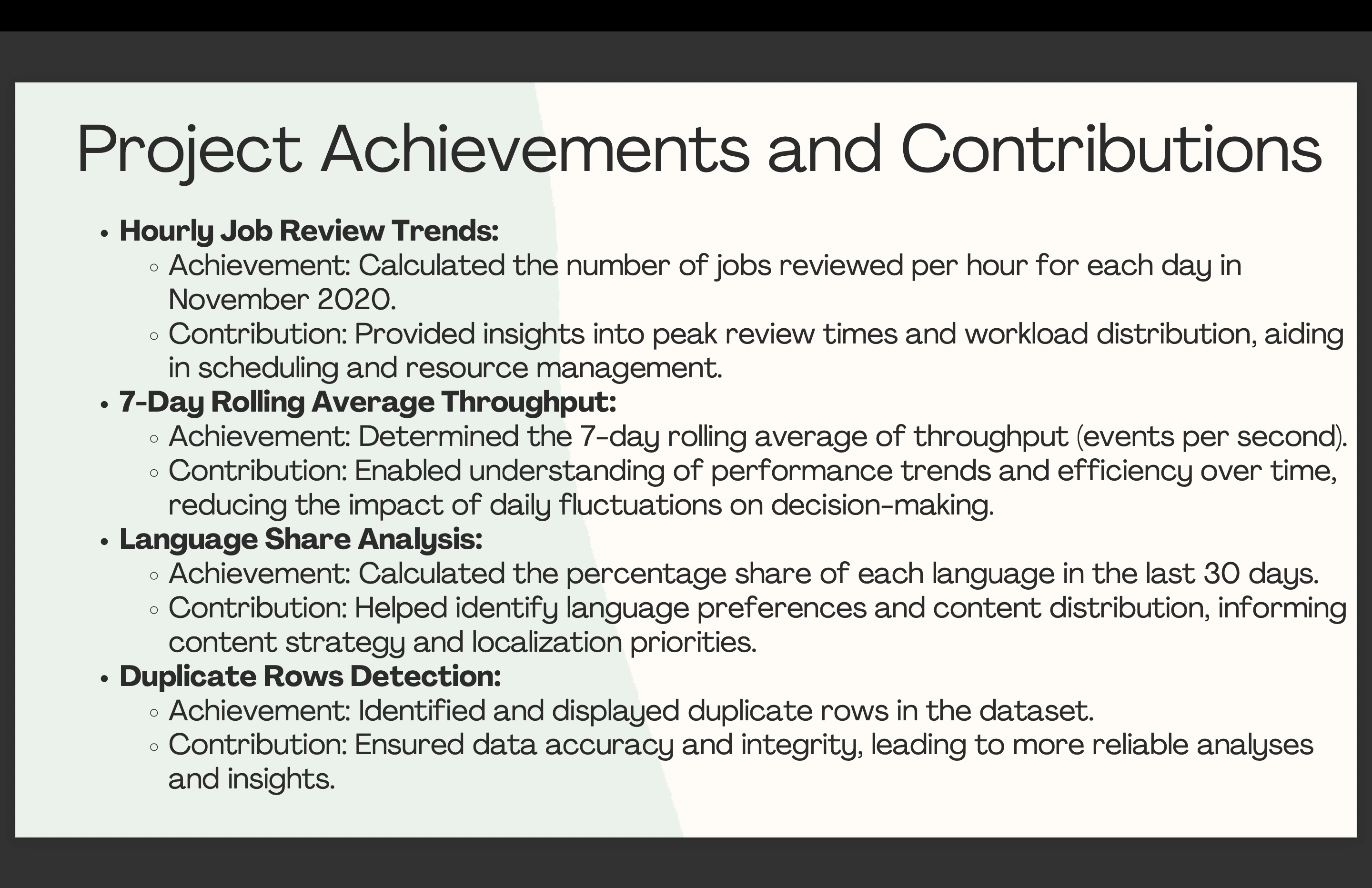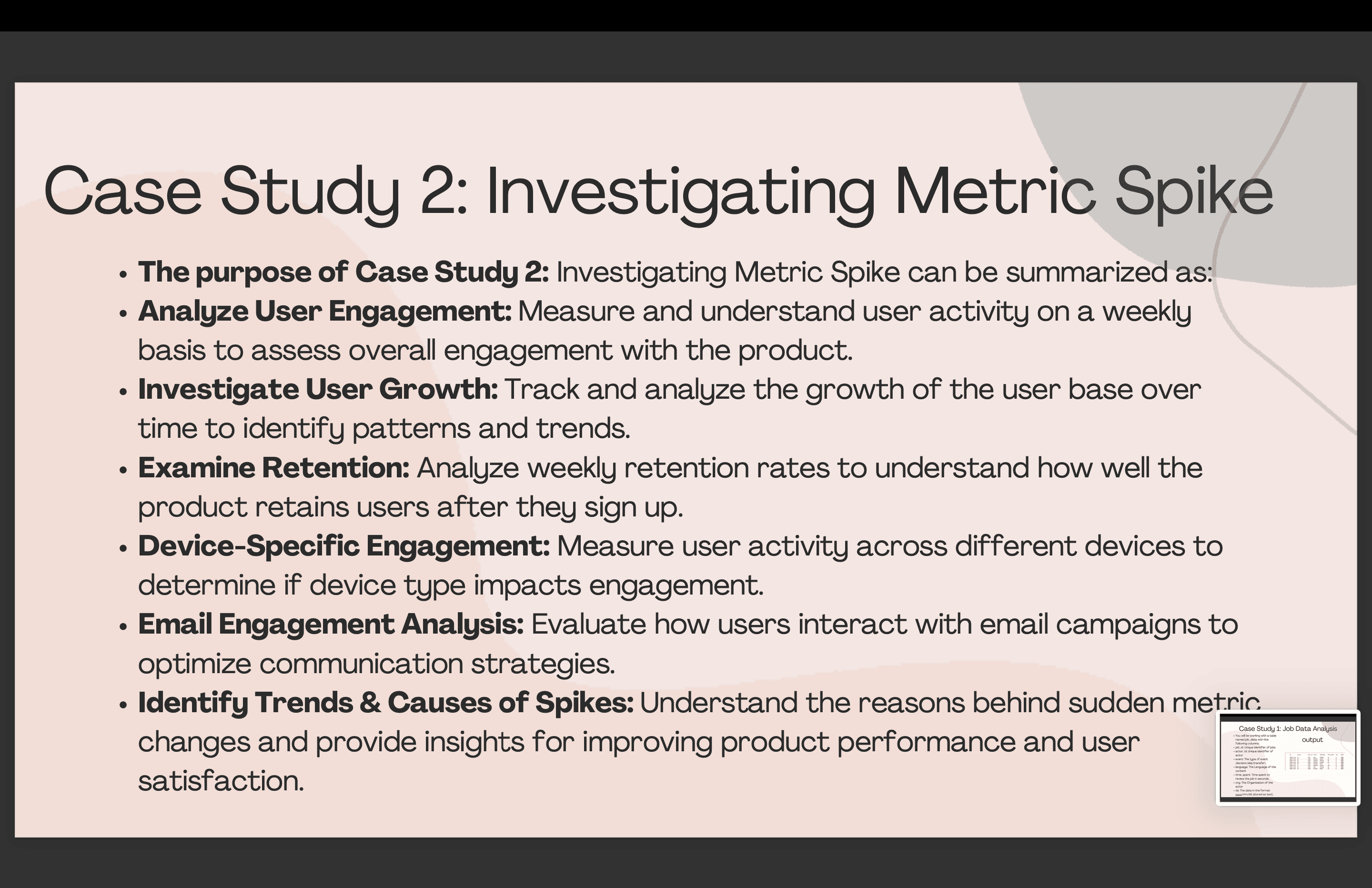 This project focused on uncovering actionable insights from operational and user interaction data to optimize decision-making. Through SQL case studies, I helped simulate real-world analytical problem-solving for internal teams across departments.